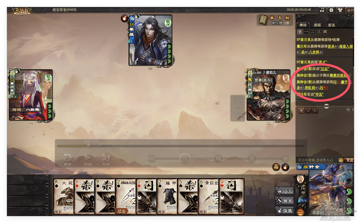 迂志展示等于4,本轮用牌小于4;或者本轮摸5上轮摸4,心大于志,就会受到反噬,必须在“删除宗族技”和“受到一点雷电伤害”中选择一项。如果你删掉了宗族技,后续再触发会锁定掉血。正常玩族钟会,数好用牌保证心等于志,也就是我前文提到的每轮摸4,稳定循环。需要急功输出,族钟会也可以主动控制条件,让心大于志,再通过【铁锁连环】自己和其他角色,利用迂志打伤害。在斗地主模式,族钟会反复迂志输出,吃桃回复,技能分和回复分都会随之增加,是长对局比分结算规则中,有利的技能。