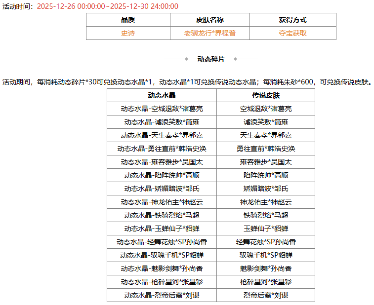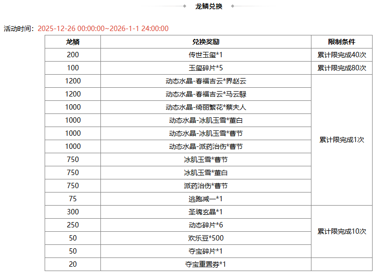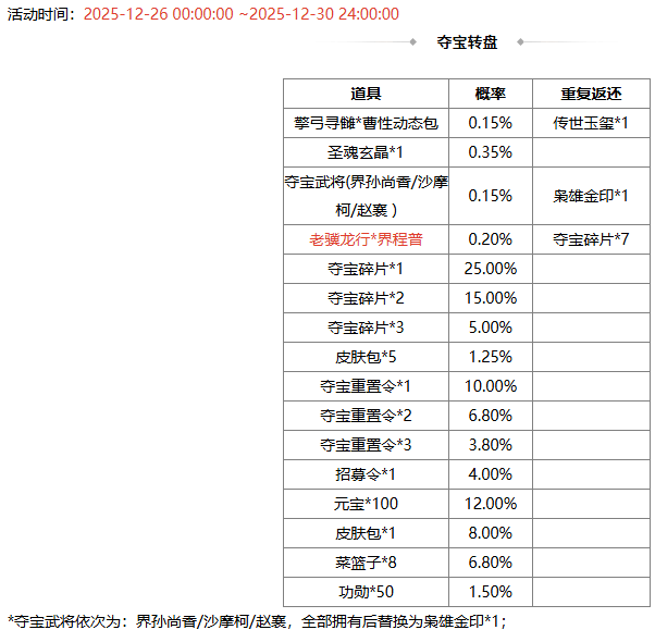 *本期返场闪耀龙珠活动(闪赵云)、25出伏龙珠活动(界王异)、七夕龙珠活动(孙茹)、踏青龙珠活动(陆凯),龙珠可购买时间:2025-12-26 00:15:00~2025-12-30 24:00:00;