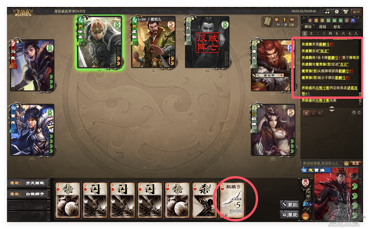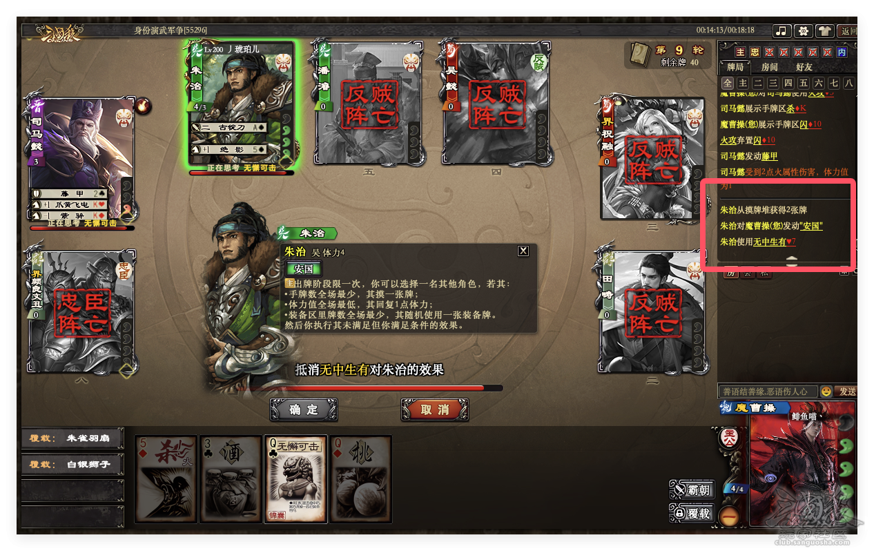 【无中】牌序:曹操手牌有装备顺拆时,先无中探测无懈,保证顺拆的正常使用,提高后续进攻命中率。
