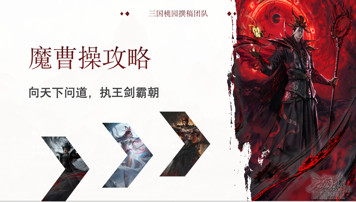 身份局魔曹操与标界曹操互通。作为主公首轮霸朝,对反和内的威压很强,在一些群内局被列为禁将。场上有两个真忠臣,这两队友思维正常一定会给出,自己手中最好的牌,再不济他也会给你一张最简单有用的杀。其他人身份也不难判断,给牌的,给的牌质量不好的,可能是一种惧怕被杀的表态,但不给牌的一定是反或内。主公魔曹操通常第一轮直接入魔,通过霸朝的给牌信号选取先手盲狙目标。