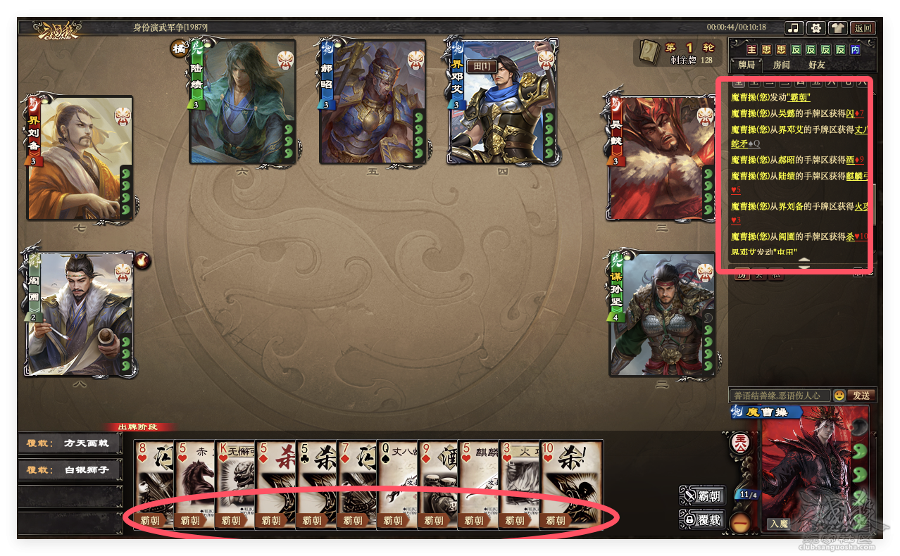 当前手牌:包括曹操自己摸牌阶段摸的牌和其他角色通过霸朝给你的牌,张松献图牌不算,也不包括正式进入出牌阶段后再摸上来的牌。想要曹操打多刀,霸朝给杀比给装备更有效。