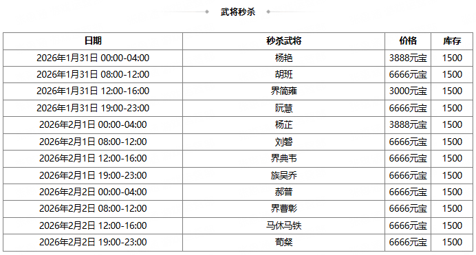 *2026-1-31 00:00:00 ~2026-2-7 24:00:00,蛮帼英飒*花鬘(动态) 180夺宝碎片、孝鲤跃冰*王祥 70夺宝碎片 限时上架夺宝商店。2026-2-8 00:00:00 起,蛮帼英飒*花鬘(动态)、孝鲤跃冰*王祥 下架。