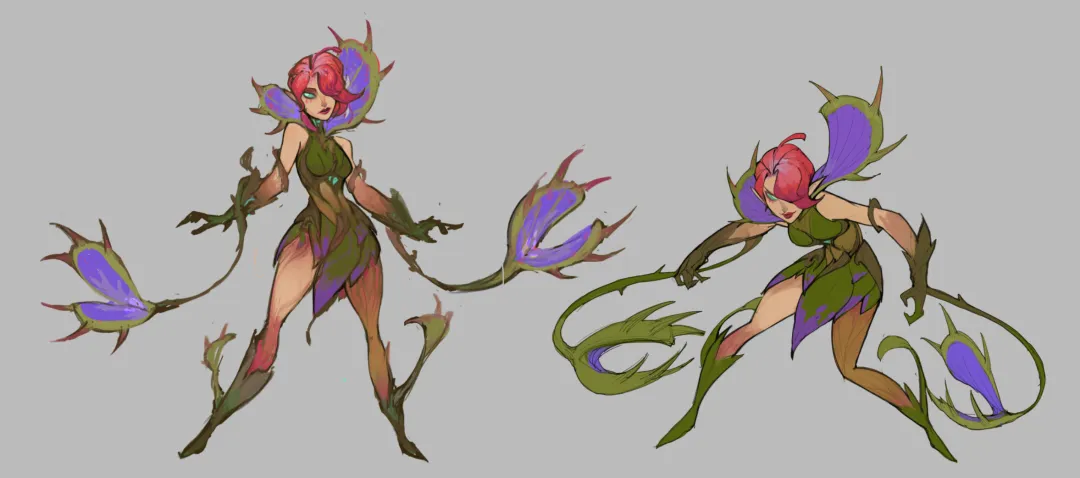 发型选定鲜艳的猩红短发,利落的造型适配林间行动,而“猩红”是母树被污染后魔能浸染的结果,成为她过往经历的视觉符号。核心细节设计中,荆棘从手腕缠绕至肘部,兼顾装饰性与技能需求,战斗时可延伸变硬用于甩击,其上点缀暗色小花呼应“毒萝花妖”称号。