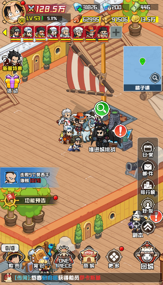 船长们开始挑战前可以直接一键上阵战力最高的船员的喔,当然也是可以手动搭配肉盾+输出+治疗的船员进行挑战