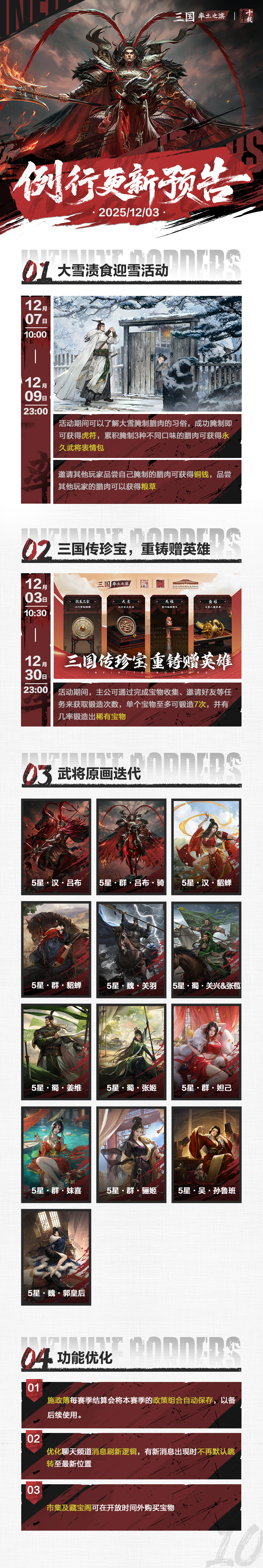·2025年12月07日 10:00:00 - 2025年12月09日 23:00:00-活动介绍·12月09日0点前开启的S1、所有S2及以上赛季服务器开放·历史势力值≥200的角色可以参与游戏·活动期间可以了解大雪腌制腊肉的习俗,成功腌制即可获得虎符,累积腌制3种不同口味的腊肉可获得永久武将表情包·邀请其他玩家品尝自己腌制的腊肉可获得铜钱,品尝其他玩家的腊肉可以获得粮草