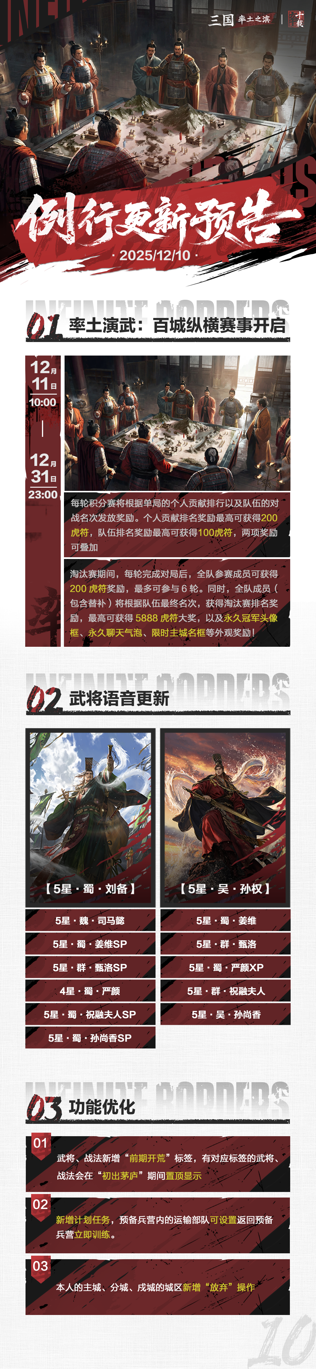 -对于、的主公,我们也将在2025年12月15日 – 2026年1月6日期间,同步开启《率土演武:百城纵横》活动!并在《百城纵横》活动开放期间的每周六、周日20:00各开启一场活动玩法对局。参与活动最多可获得1800虎符奖励!
