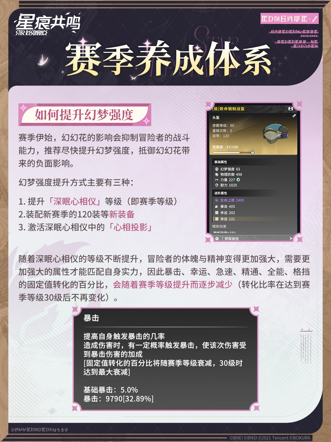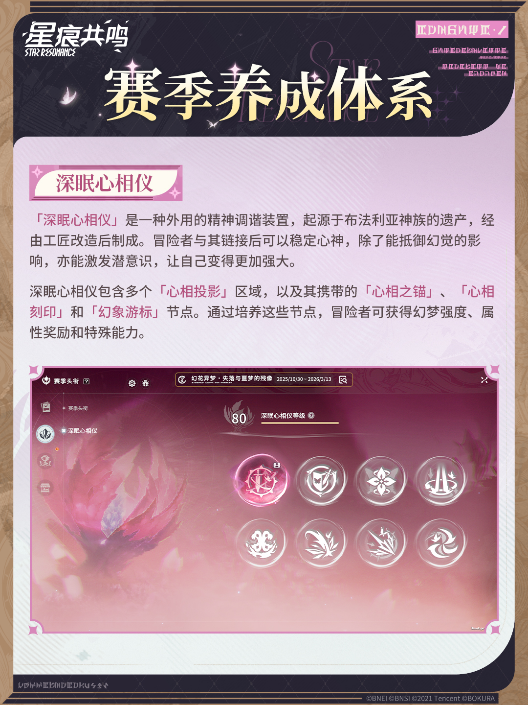 随着赛季更替,冒险者在幻梦赛季中将迎来全新的赛季特性与玩法,与此同时,新赛季养成系统「深眠心相仪」、新赛季通行证「幻梦通行证 · I」也将同步与大家见面。