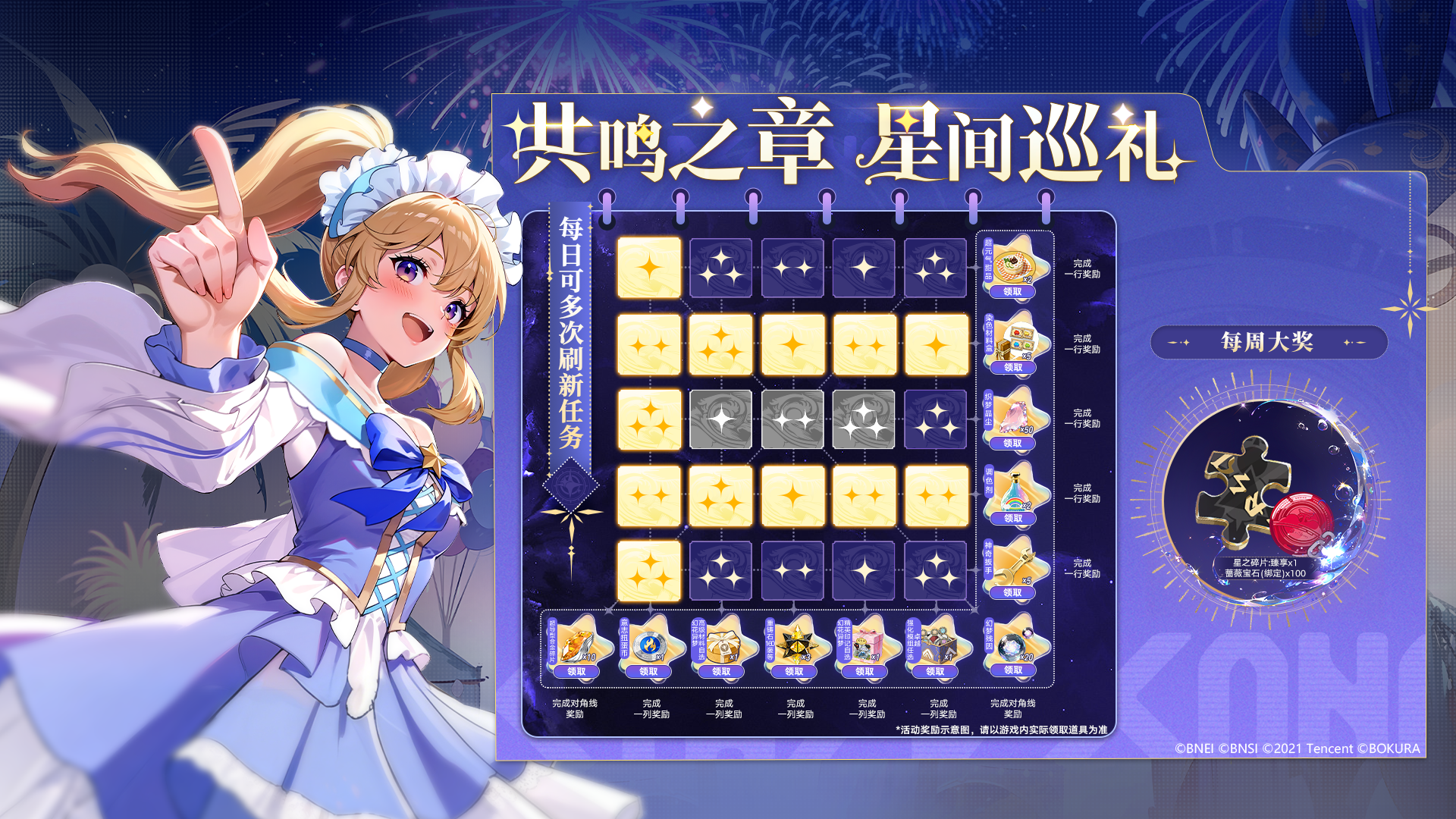 2)一周内,完成所有25格任务,即可获取本周大奖:星之碎片·臻享×1、蔷薇宝石(绑定)×100;每周任务状态刷新时间为:星期一 0:00。