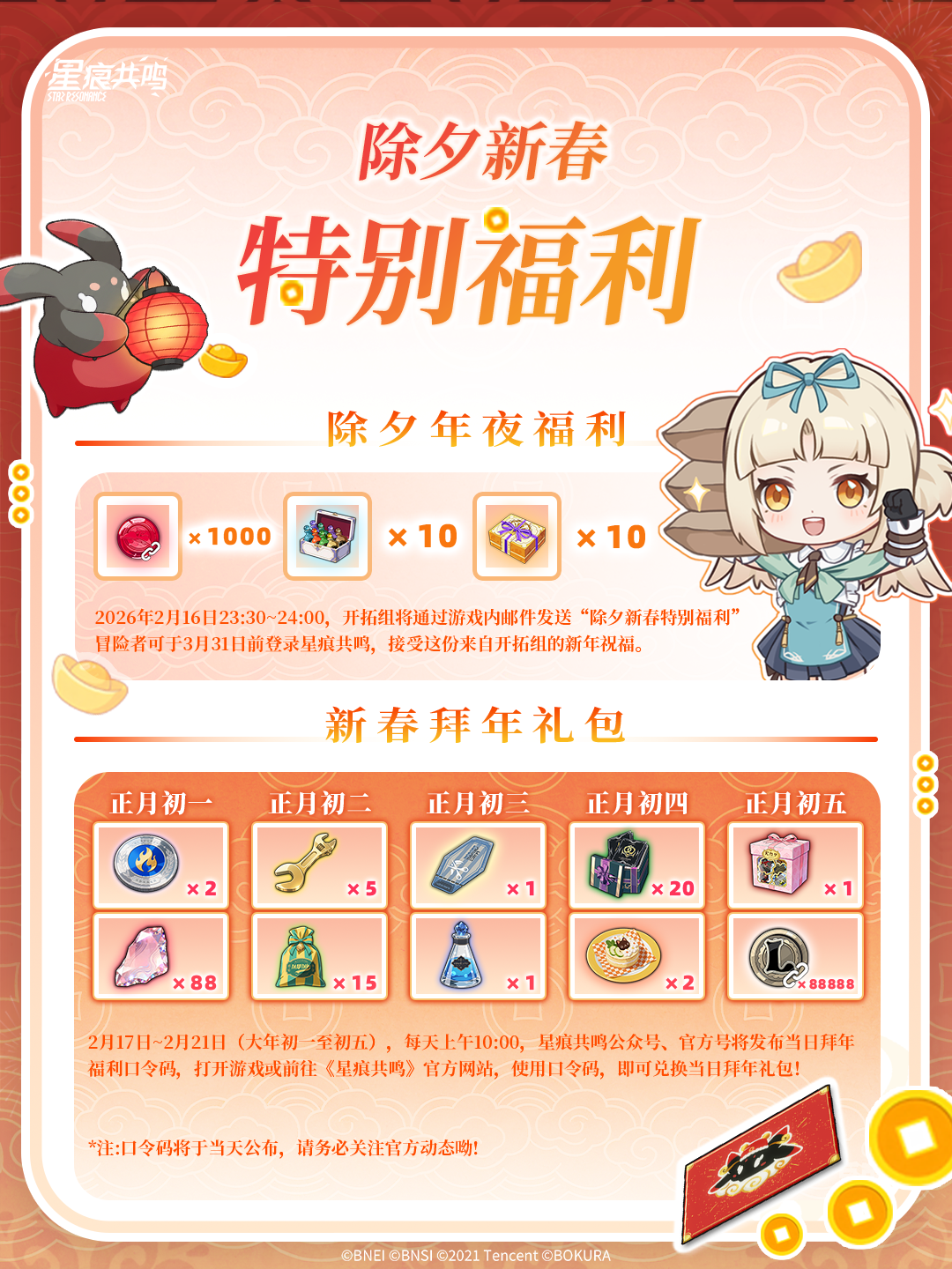 大年初一至初五还有丰厚的拜年礼——意志扭蛋币、织梦晶尘、神奇扳手、家园币等超多福利口令码,助力你的世界探险,详情请关注各个渠道的官方账号,冒险者不要错过哟~