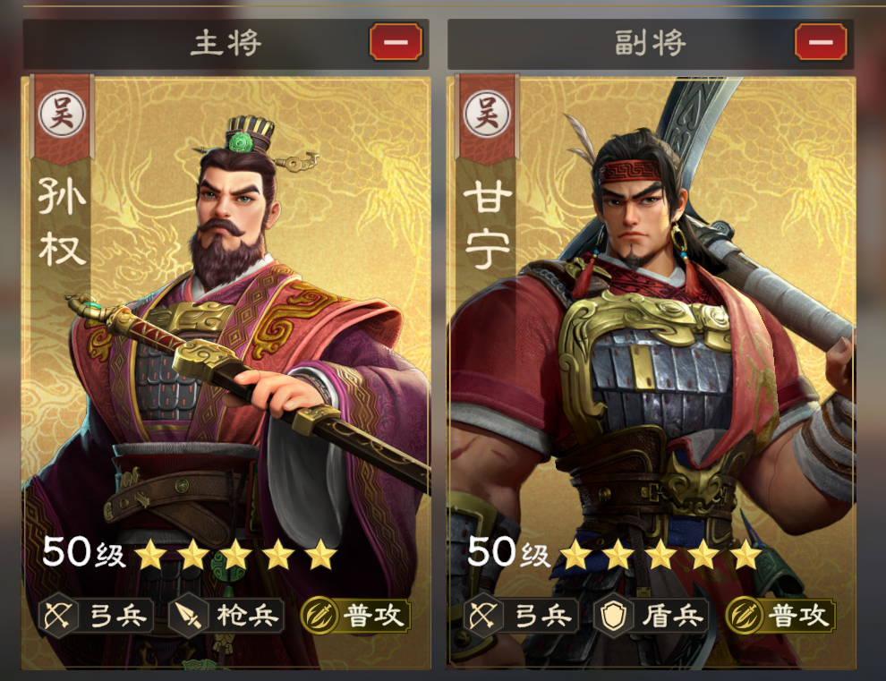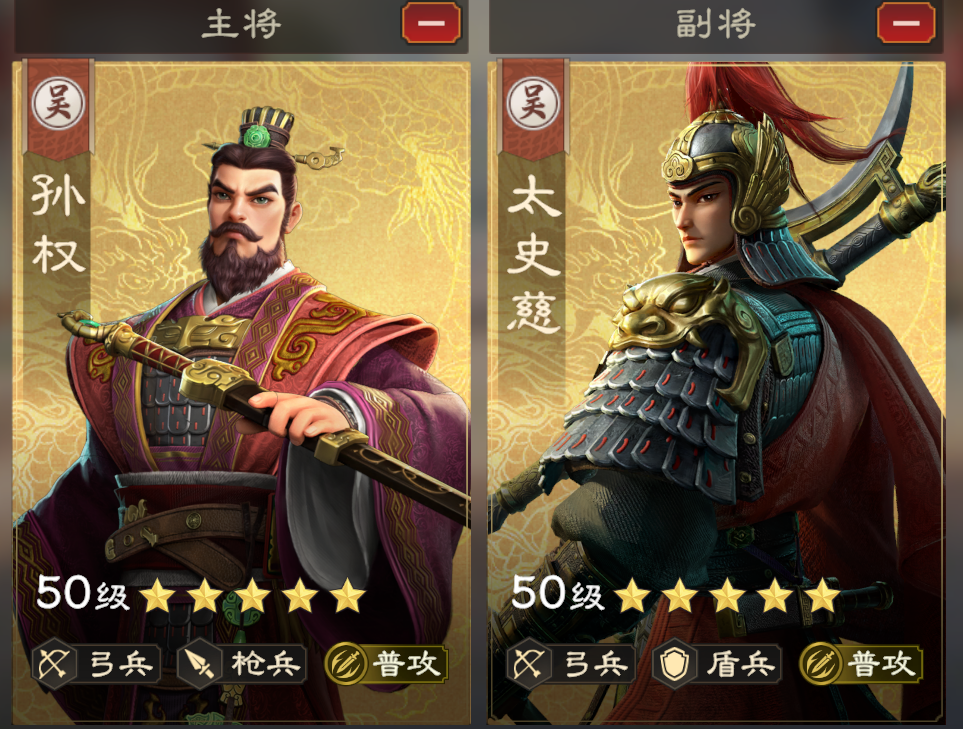 孙权在练度稍低时,可以走枪兵路线,主打持续作战;在高练度的情况下,首选弓兵配置,可以打出更高爆发,快速歼灭敌方兵力。孙尚香可给队伍提供攻击力加成,在队伍单位数高于40时可降低受到的反击伤害,低于40时可提高普攻,双核搭配可以在短时间内打出高额爆发。除了以上加成外,孙尚香可给队伍提供穿透(普攻队核心增益),用于降低反击伤害,从而提升队伍生存、持续作战能力。