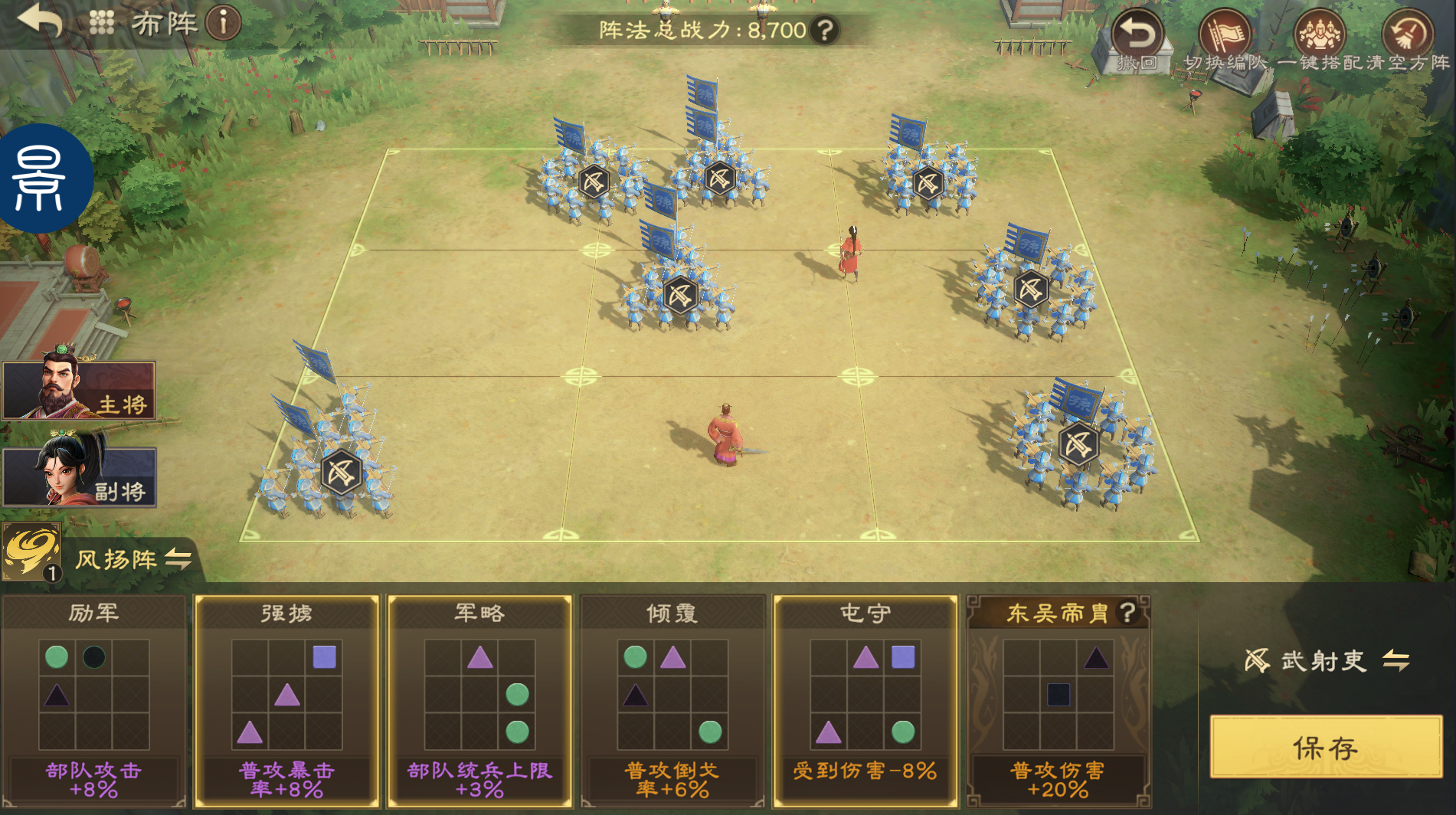 阵法可优先选择风扬阵,在释放技能后可提升20%普攻伤害,再加上孙权自身的觉醒、被动暴击增伤,可打出更高伤害。阵型可优先选择励军、强虏、屯守,如果没有风扬阵,可以用雁形阵下位替换。