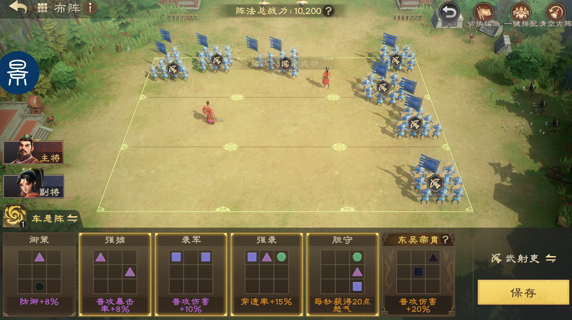 车悬阵是普攻队的核心阵法,能够概率令队伍进入穿甲状态,无视目标反击、保证己方兵力健康,拥有更强的持续输出能力,阵型可优先选择强掳、袭军、强袭、胆守。如果有孙尚香,可激活东吴帝胄,则选择东吴帝胄、强掳、袭军。