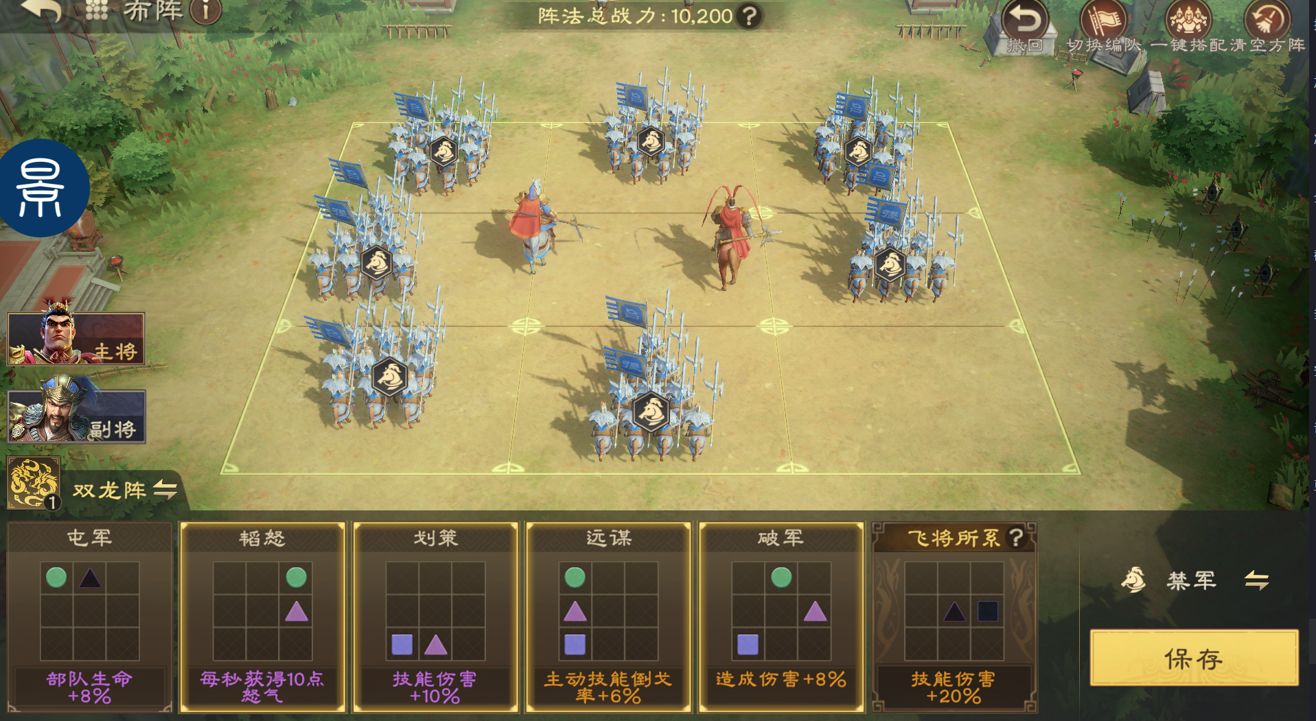 双龙阵可提高部队暴击率及技能伤害,更适配吕布体系,可通过高额暴伤在短时间内快速压低敌方队伍兵力。阵型可以优先选择韬怒、划策、远谋、破军。