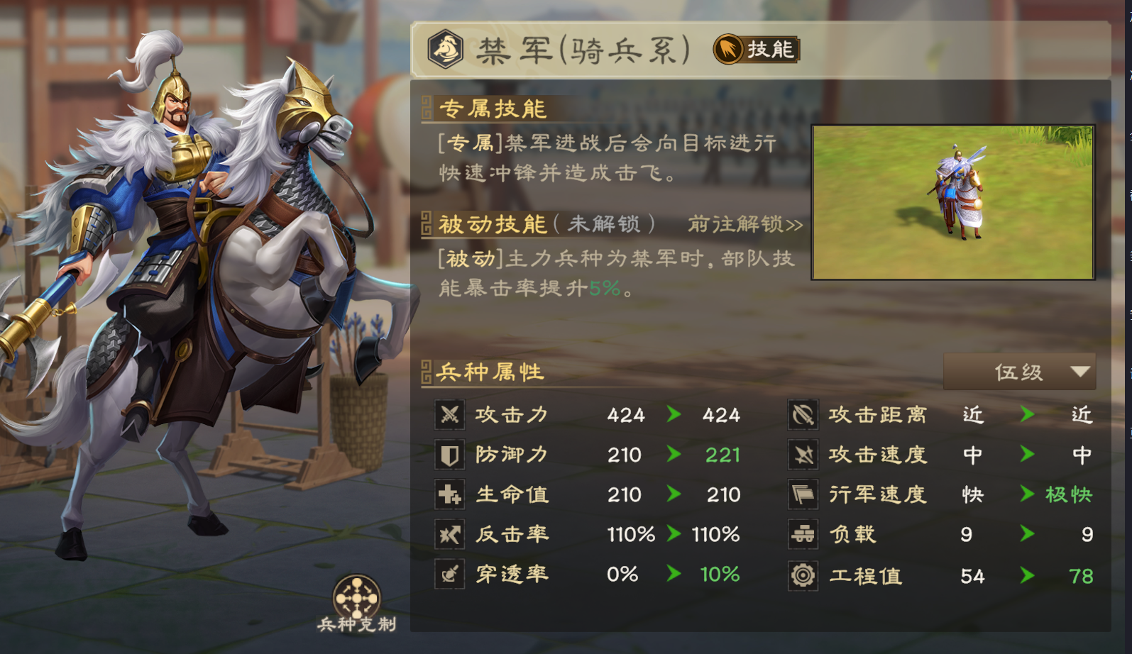骑兵队伍构建推荐选择禁军,禁军有冲锋,提升暴击率的能力,可以更好的压制弓兵队伍,而且可提升部队暴击率,提高队伍整体爆发。骑兵在S1会是相当不错的选项,有机动性、持续作战优势,加上其对弓兵的克制,在大规模团战中可发挥更大作用。
