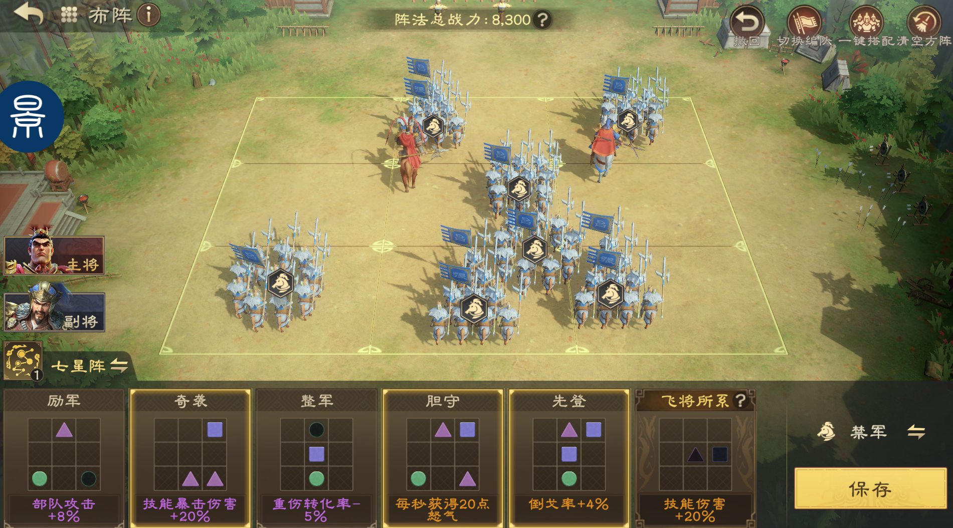 七星阵在部队普攻后概率提升主动技伤害,并且可通过“胆守”额外获得怒气,提高主动技释放频率,阵型可以优先选择胆守、奇袭、先登。