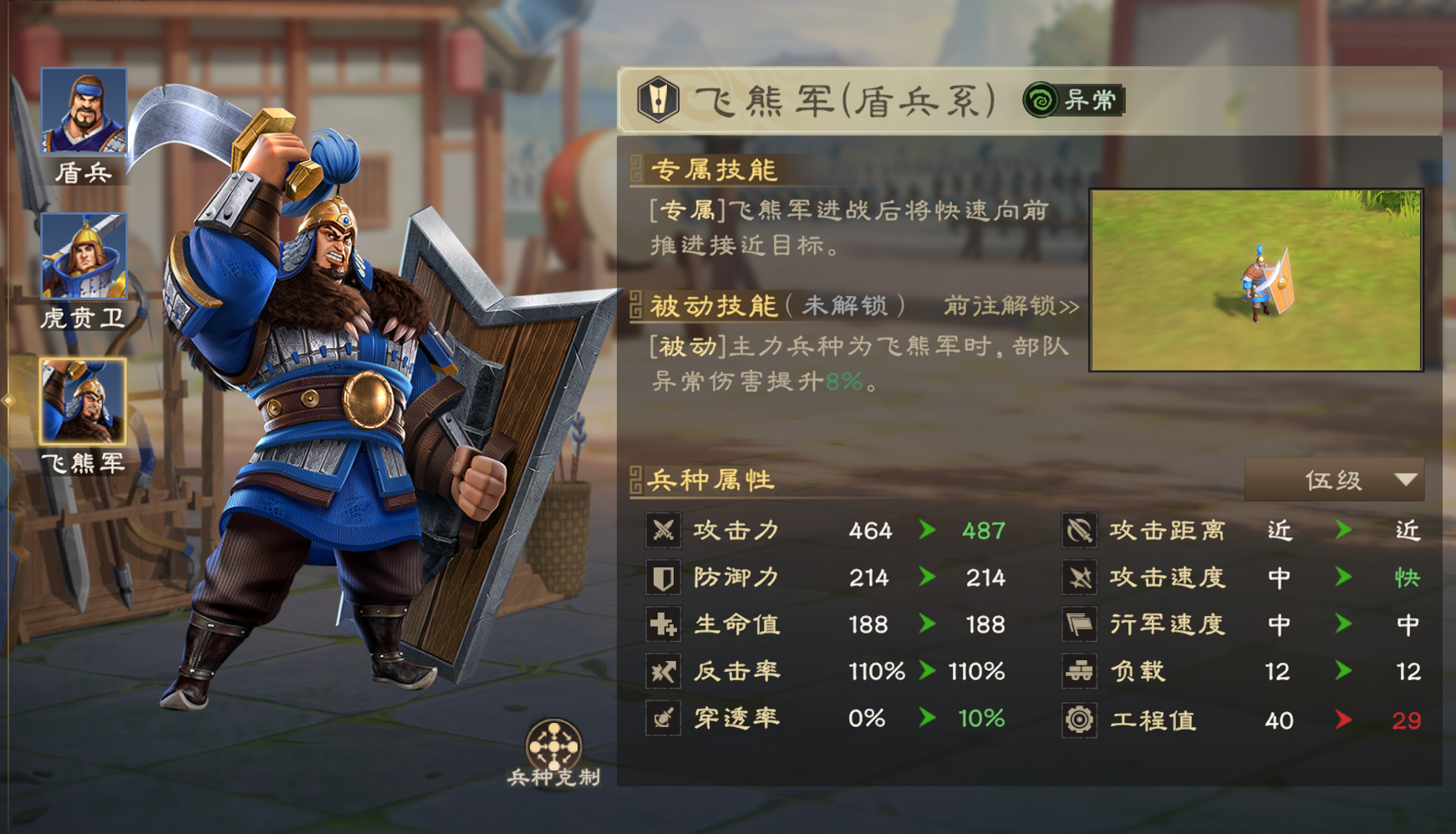 考虑到盾兵拥有更高的生命、防御数值,一般来说推荐优先选择盾兵构筑。盾兵路线选择飞熊军,飞熊军防御高、生命值高,而且可提高异常伤害,在慢速作战下强度更高。