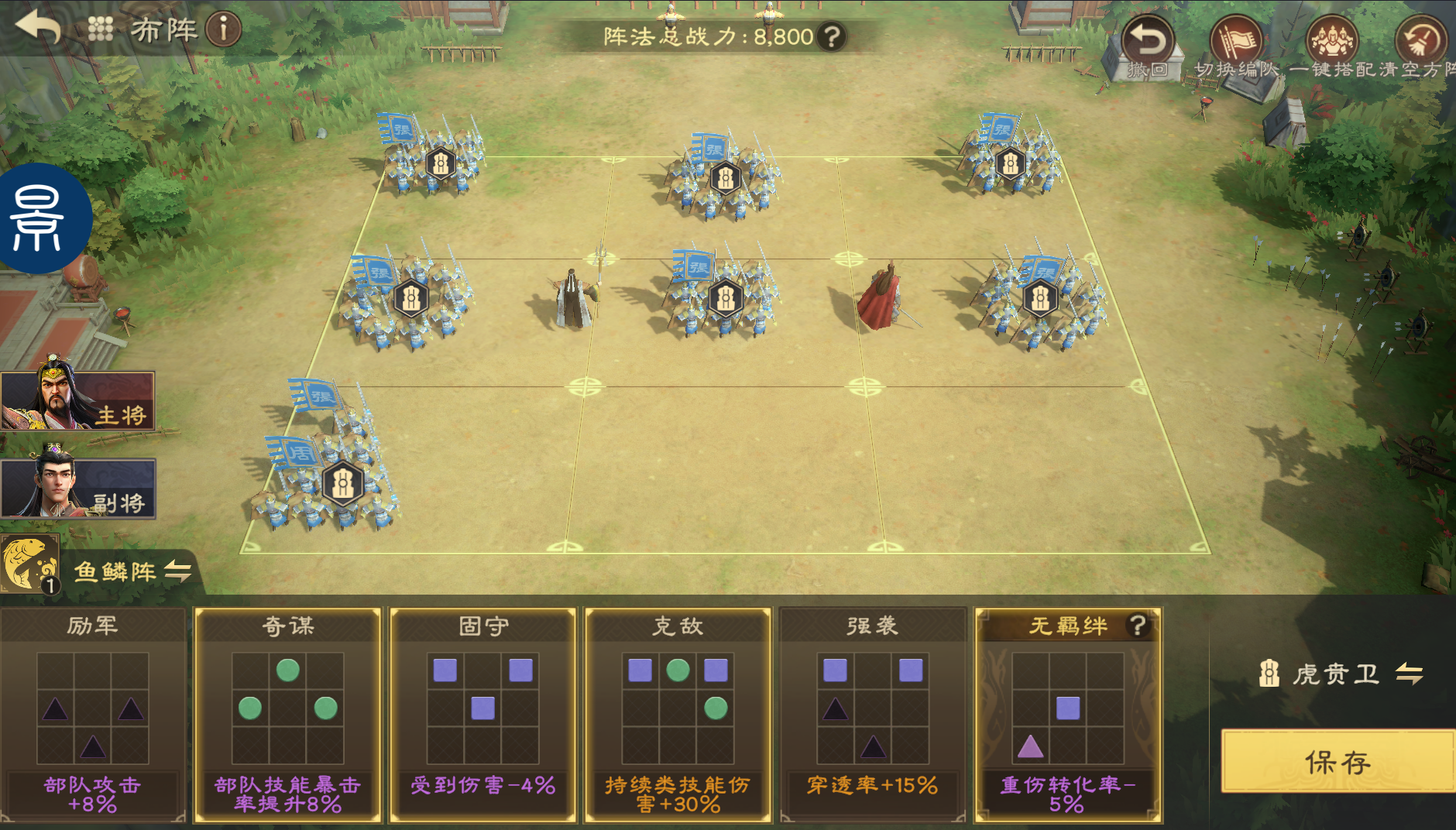 周瑜施加灼烧与“副将释放技能”相关,没有八卦阵,可选择鱼鳞阵,此阵法可提高异常伤害、怒气获取,再通过主动技、异常状态附加来造成更多伤害。阵型推荐选择奇谋、固守、克敌、无羁绊;如果有激活谋定天下(诸葛亮、司马懿),就选择谋定天下、固守、克敌。
