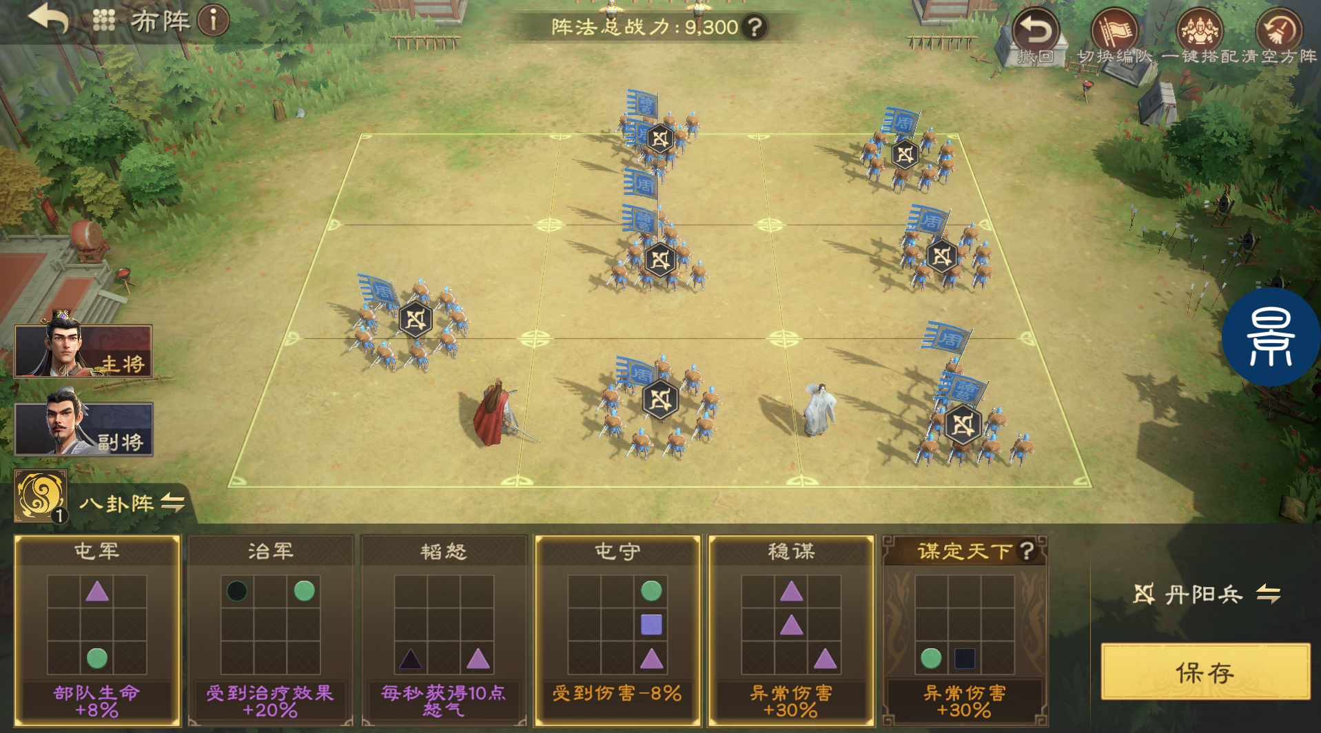 周瑜的“减怒”需要有灼烧的稳定附加,八卦阵在部队普攻时概率给目标添加灼烧,可提升灼烧覆盖,也比较契合于异常体系。阵型可选择屯军、屯守、稳谋;如果有谋定天下羁绊,就选择屯守、稳谋、谋定天下。