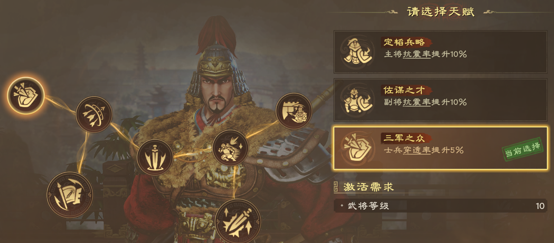 推荐路线:三军之众(提升穿透)→双带两腱(弓兵提升攻击)→强袭之阵(携带普攻阵法,提升普攻伤害)→一鼓作气(提升普攻伤害)→40级天赋(基于需求选择)→攻无不克(提升普攻伤害)→50级天赋(基于需求灵活选择)