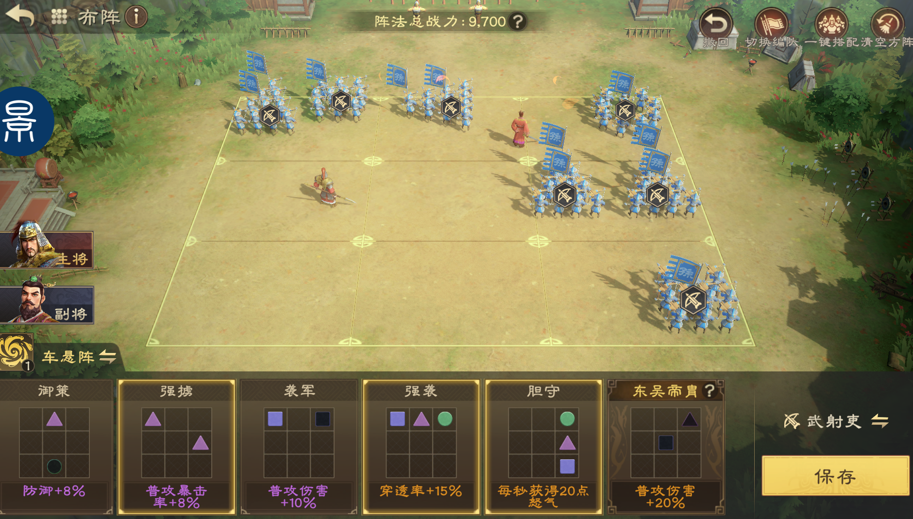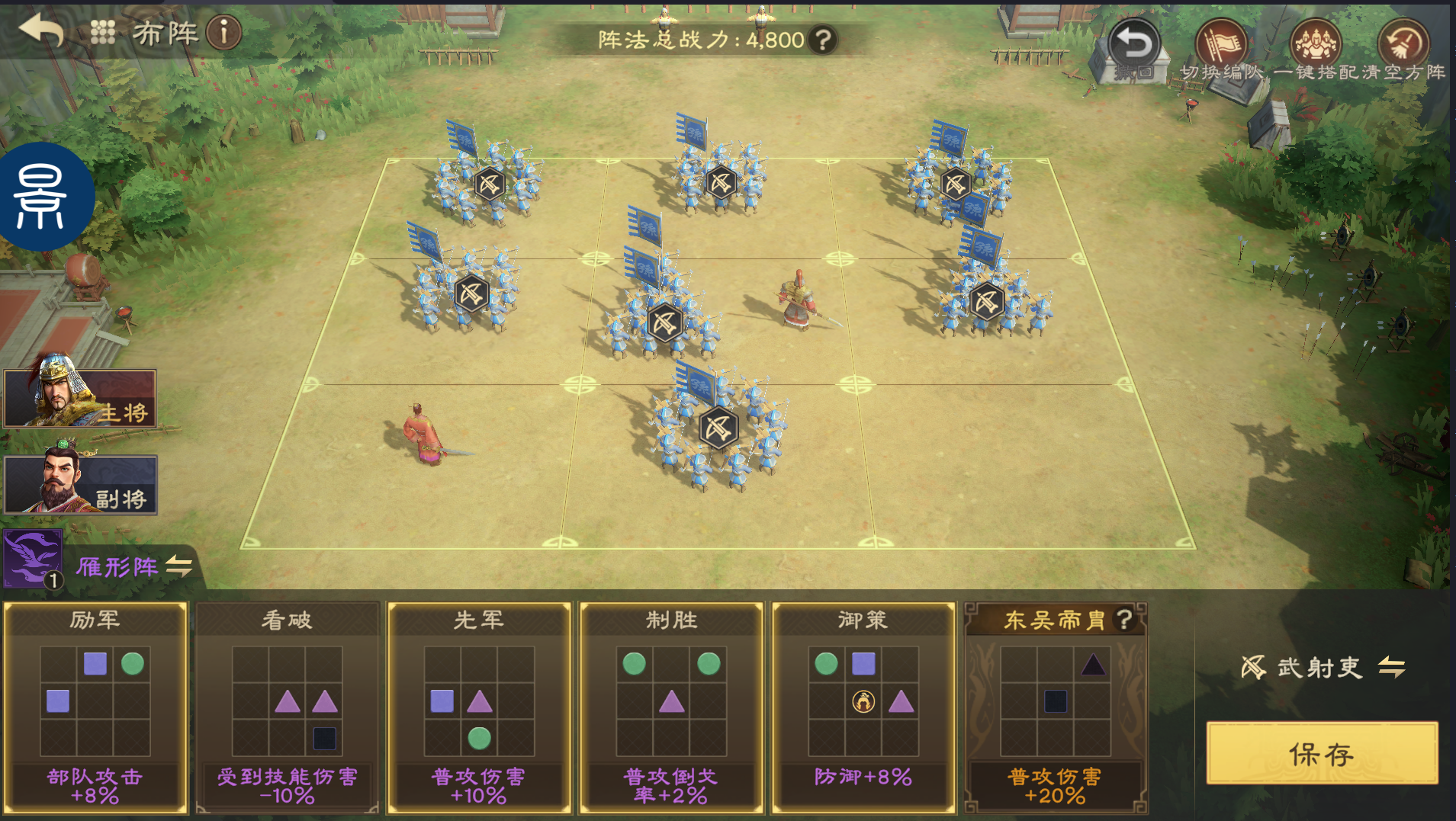 初期普攻流可以用雁形阵,雁形阵可提升队伍暴击率,阵型选择励军、先军、制胜、御策,后续如果有抽到车悬阵、风扬阵在进行替换。