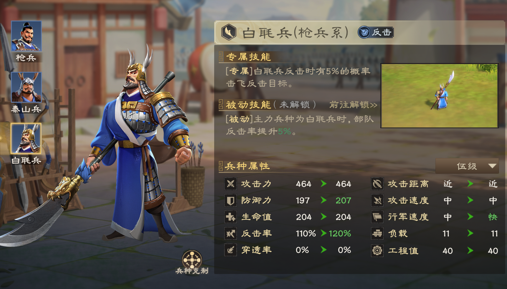 反击体系建议优先选择白毦兵,此兵种在反击时概率击飞反击目标,可降低队伍战损,并且可提高部队反击率。潘凤自带反击伤害提升、技能抗性提高,可使队伍在持续作战中输出较高的反击伤害。