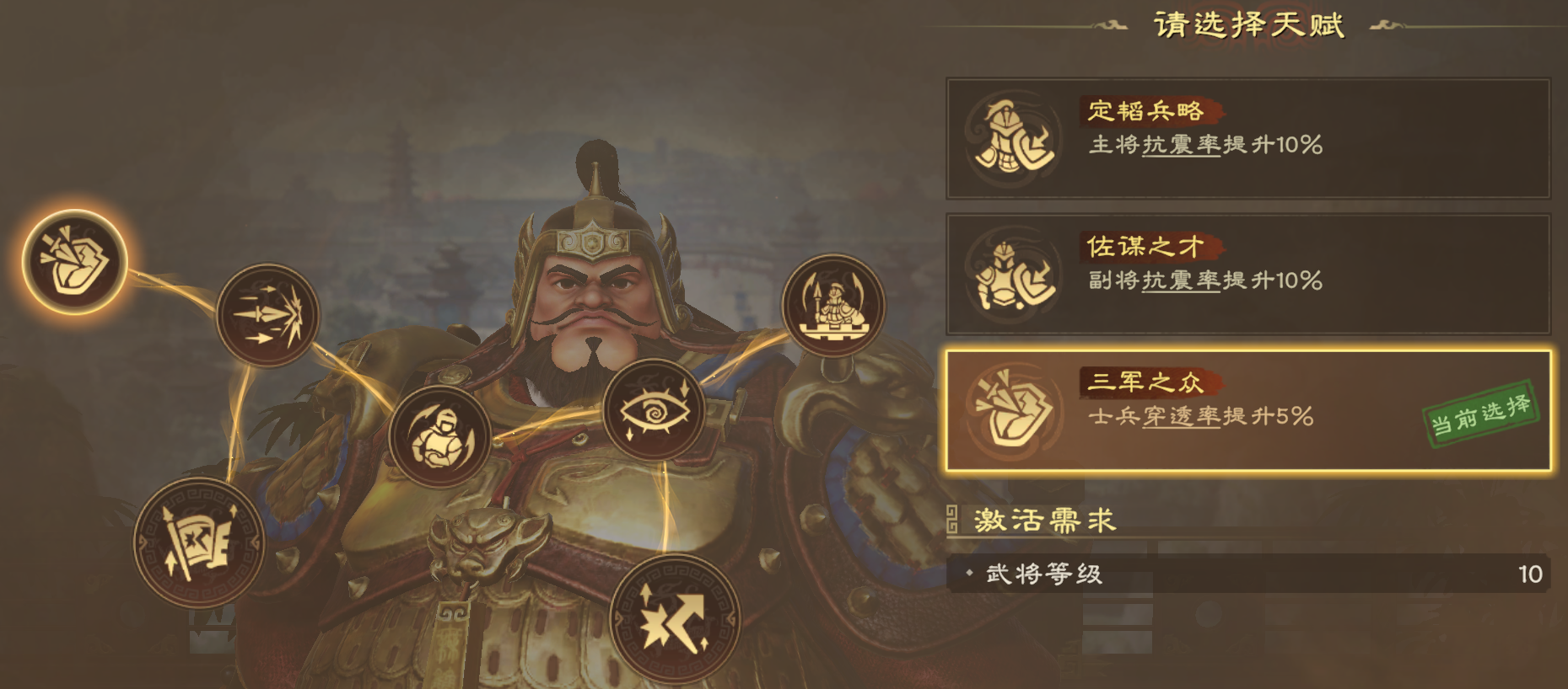 推荐路线:三军之众(提升穿透率)→长戟酋矛/百骑虎跃(枪兵/盾兵提升攻击)→固守之阵(携带反击阵法,提升伤害抗性)→反败为胜(提高反击伤害)→40级天赋(基于实际需求选择)→谋定后动(提升反击率)→50级天赋(基于实际需求选择)