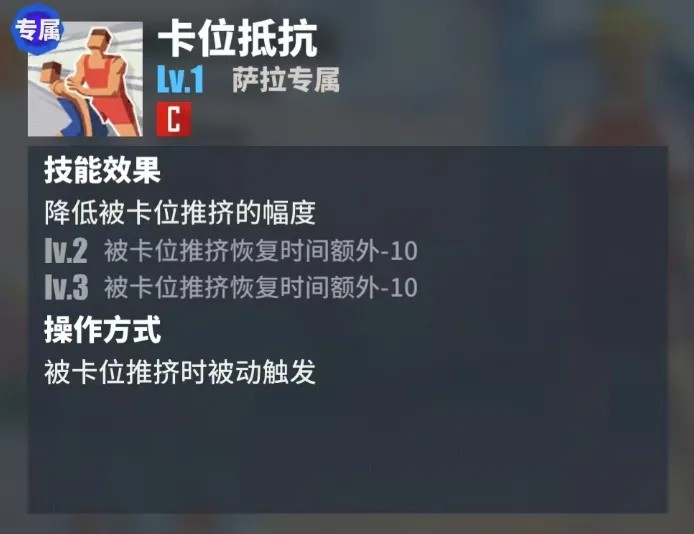 被动技能。减少了萨拉被对方卡位影响的程度,提高了她在篮下的身体对抗能力。