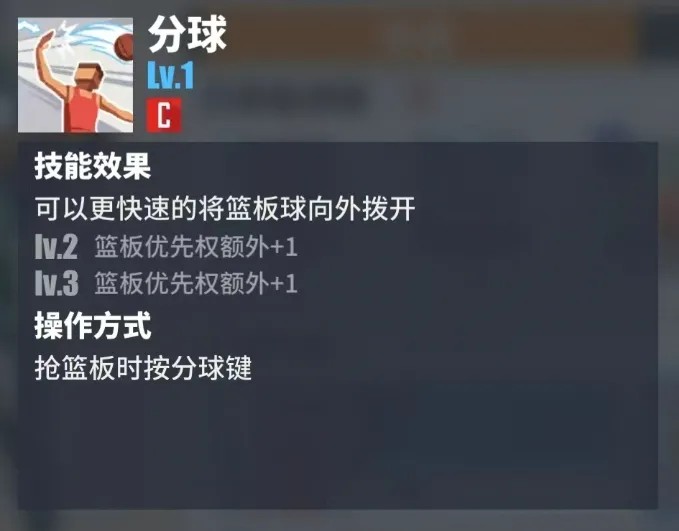 C基础技能之一。分球的优先更高,在某些情况下,卡位卡到对位球员了,但是篮板还是被对方拿走了,适当利用分球,可以在抢篮板中获利。