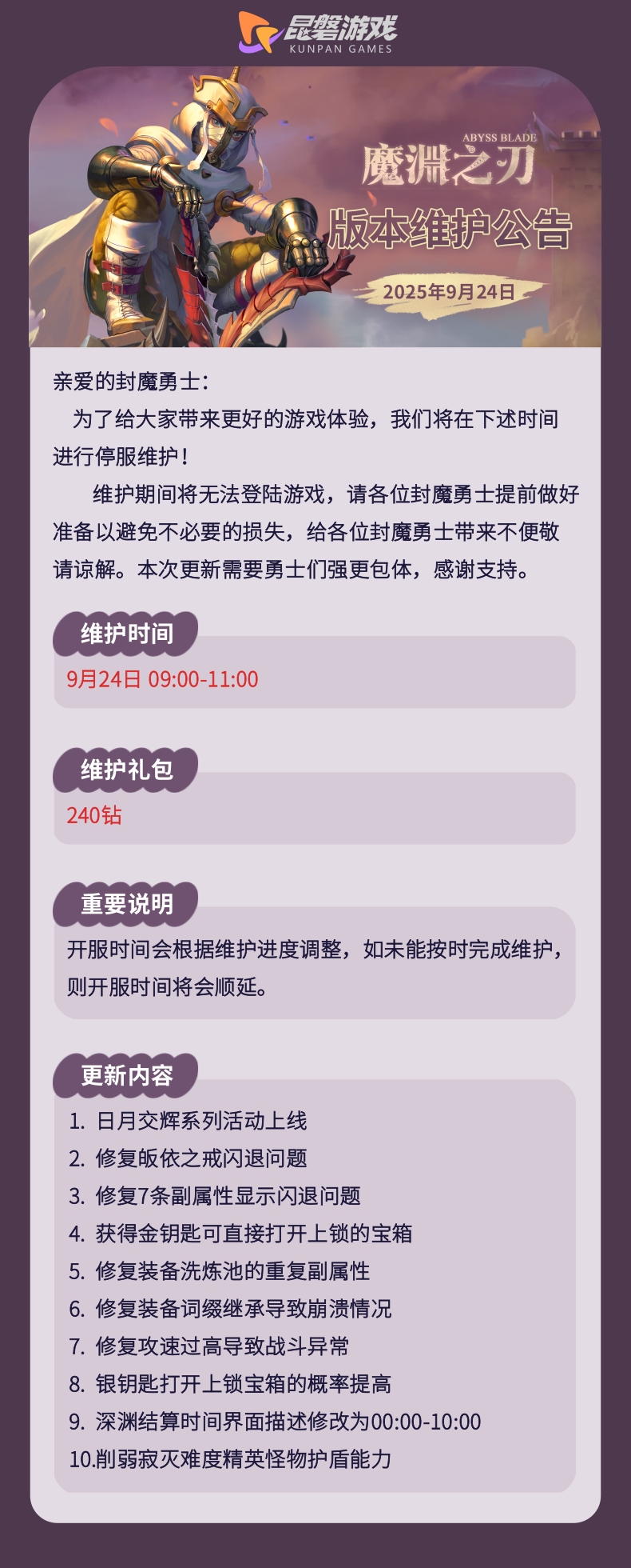 【魔渊情报局】日月交辉活动开启!9月24日版本维护公告