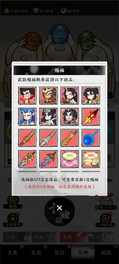 抽取宝珠累积次数,还能额外触发“赐福”,必得随机的高品质的神兵、坐骑或皮肤;此外,累计触发3次“赐福”,必得一件随机高品质皮肤。