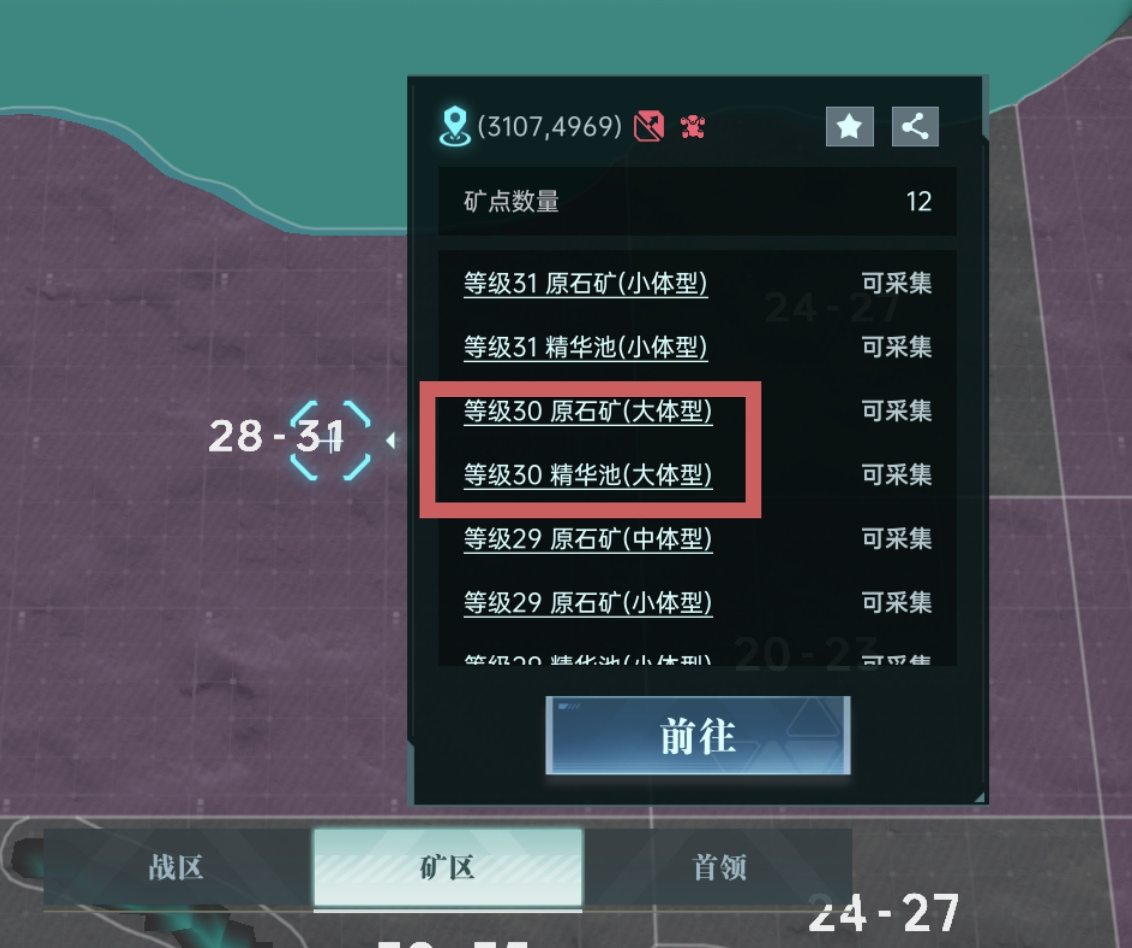 比如你用速射队带隐刺机兵(小型)打30级资源地,只需缩小地图,点击【矿区】,再选【28-31资源地】,里面所有资源矿的兵种情况就一目了然了。然后针对性选择大型兵种资源地出击,效率直接拉满。