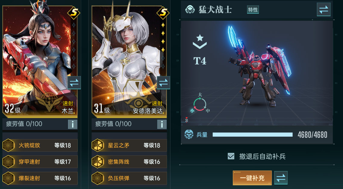 猛犬战士最适合搭配的队伍是木兰+安德洛美达一类的速射队,依靠高攻速更频繁地触发技能效果,搭配安德洛美达的技能和“负压供弹”的减防效果,让队伍的整体伤害有极大提升。
