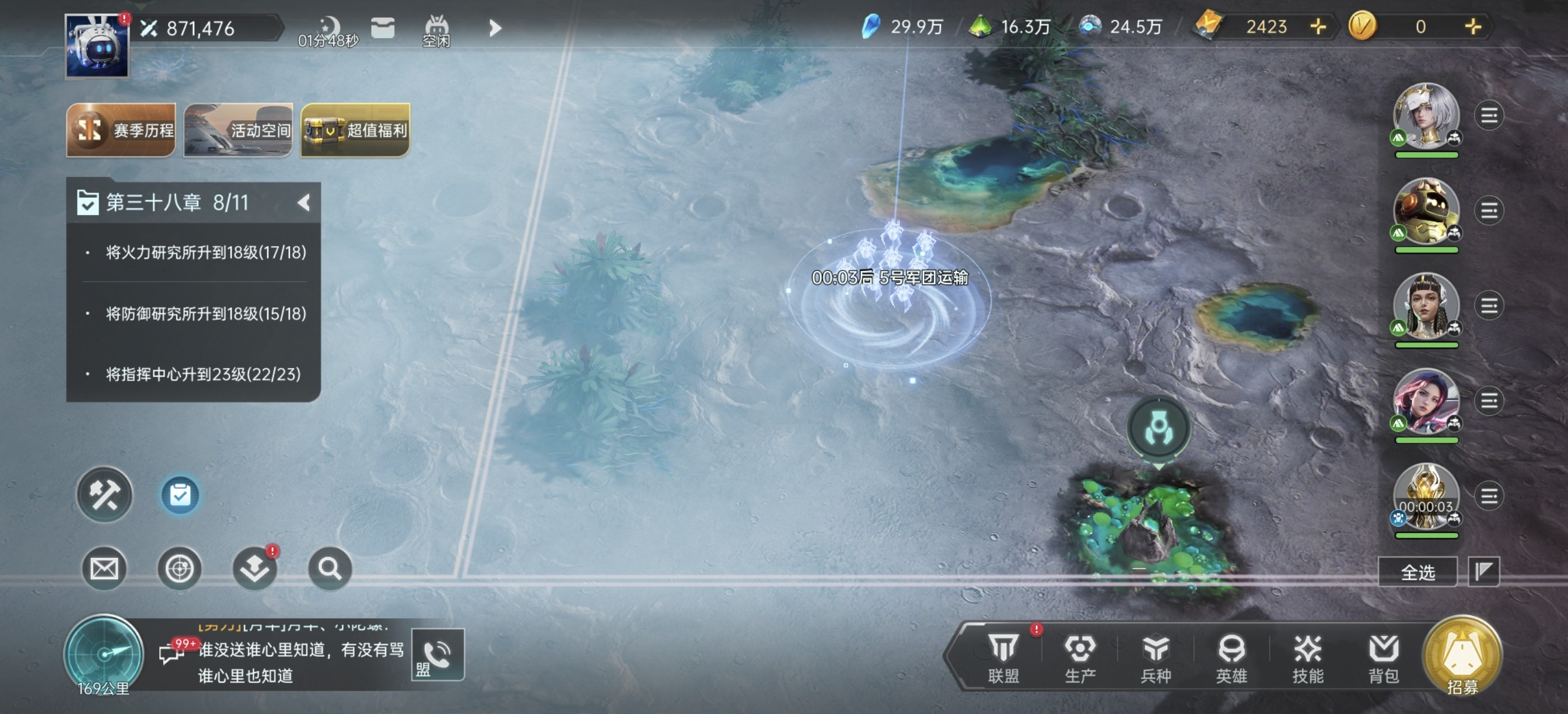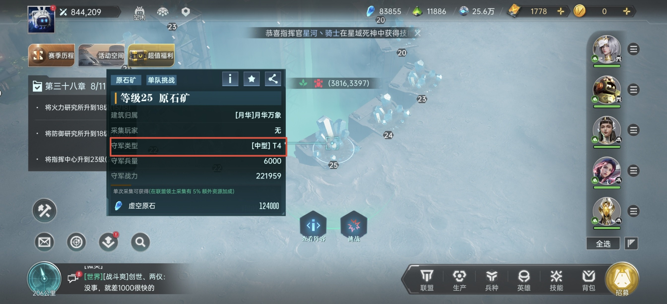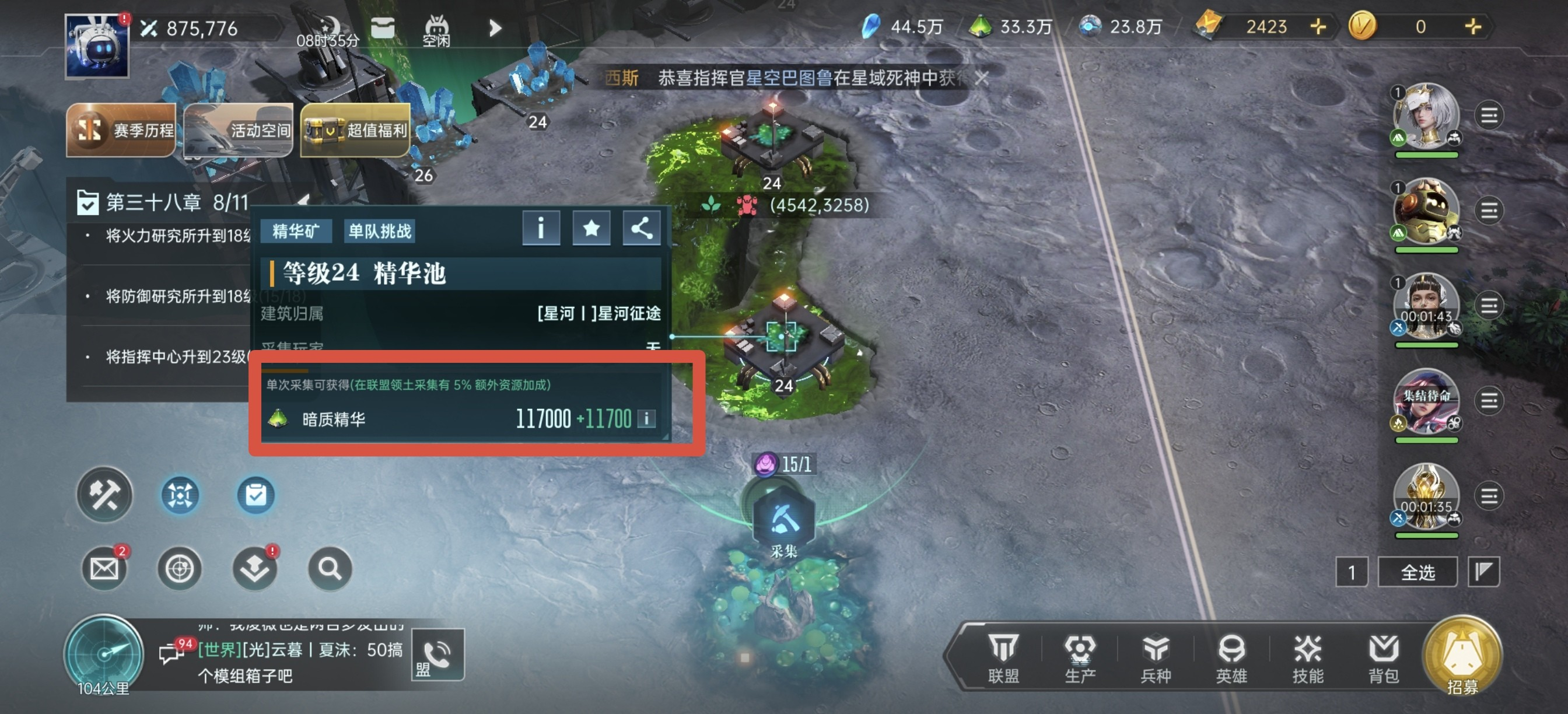优先在联盟领土范围内采集,有5%的额外加成。然后千万不要跟着主线的采集任务走,不然会损失很多资源。我们应该极限采集,也就是采集每个阶段主力队伍能极限挑战矿点的最高等级。所以在开荒期尽量把所有的资源都来培养一队主力,然后挑战更高级的矿,从而使自己的资源一定程度上领先其他玩家。
