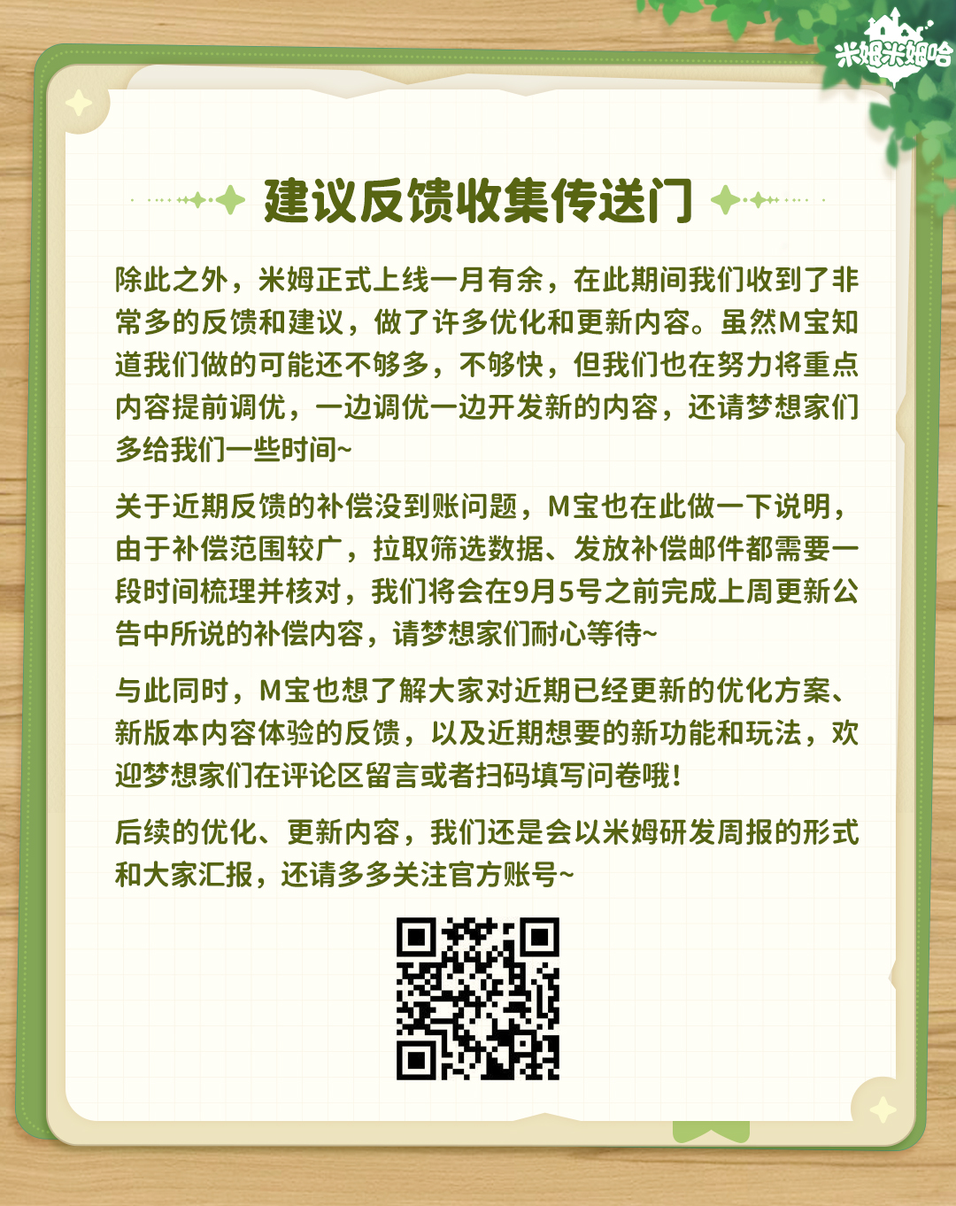 除此之外,米姆正式上线一月有余,在此期间我们收到了非常多的反馈和建议,也针对反馈做了一些优化更新内容,M宝在此也想征集大家对近期已经更新的优化方案、新版本内容体验的反馈,如果有想要的功能和玩法,欢迎梦想家们在评论区留言哦~