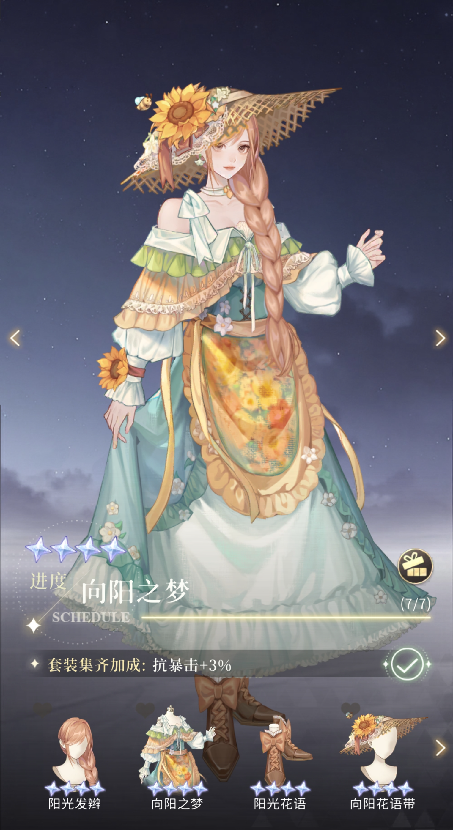 集齐「向阳之梦」套装可获得抗暴击加成。