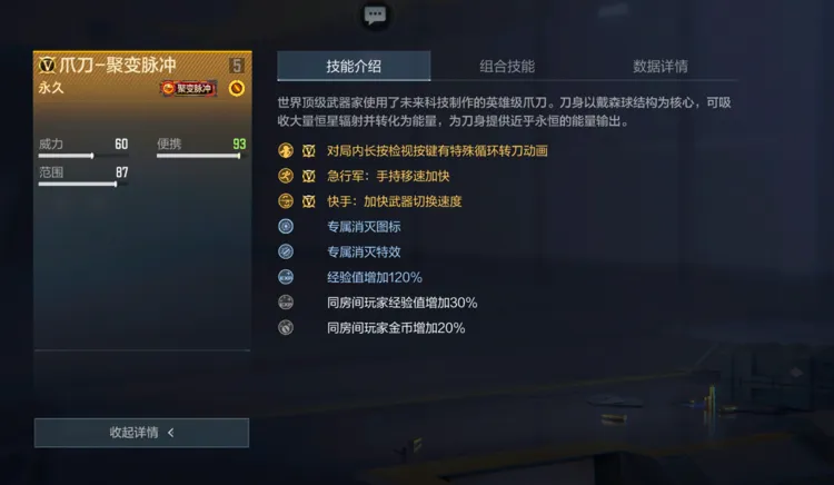 爪刀-聚变脉冲的技能有:在对局中长按检视按键时,会触发特殊的循环转刀动画;还有急行军:手持移动速度加快,快手:加快武器切换速度。实战中若需快速移动,可切换至该武器。