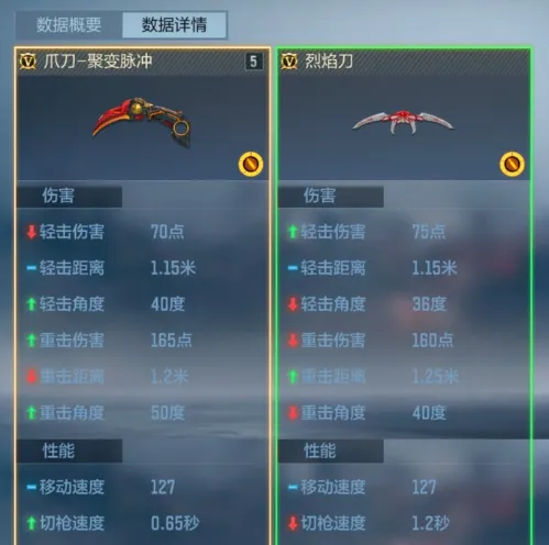 由于游戏里目前没有同系列近战武器,这里以烈焰刀作为对比。可以看出,在轻击角度、重击伤害、重击角度和切枪速度上方面,爪刀-聚变脉冲表现更优。而在重击距离上,烈焰刀则更远。