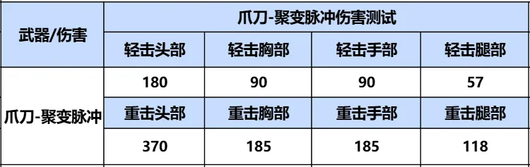 为大家测试了爪刀-聚变脉冲的伤害。可以看到,轻击头部造成180点伤害,轻击胸部和手部造成90点伤害,轻击腿部造成57点伤害;而重击只要命中敌人即可轻松击杀,即使重击腿部也能造成118点伤害。由此可见,这把武器的伤害表现相当可观。