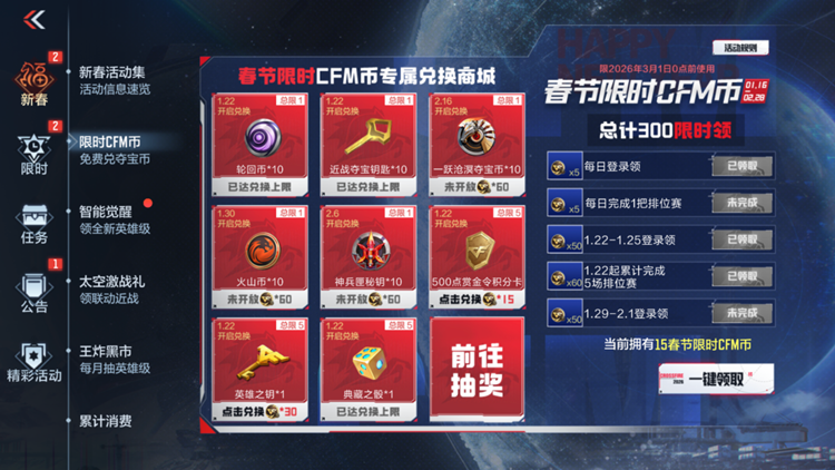总计300枚限时CFM币免费放送,活动期间,玩家通过每日登录、完成排位赛等简单任务即可轻松积攒春节限时CFM币。在专属兑换商城中,这些限时币可以兑换轮回币、近战夺宝钥匙、英雄之钥等目前上架付费活动中的活动道具,以及典藏之骰、赏金令积分卡等实用资源。另外在1月29日至2月1日期间登录,还可直接领取50枚春节限时CFM币,兄弟们千万不要错过这次福利活动哦!