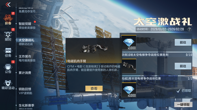 全新玩法“太空电梯争夺战”随版本更新上线,带来与众不同的星际战斗体验。参与地图“流浪前哨”,不但可以领取电磁肌肉手臂,还可获得大量钻石与稀有的限时英雄之钥!