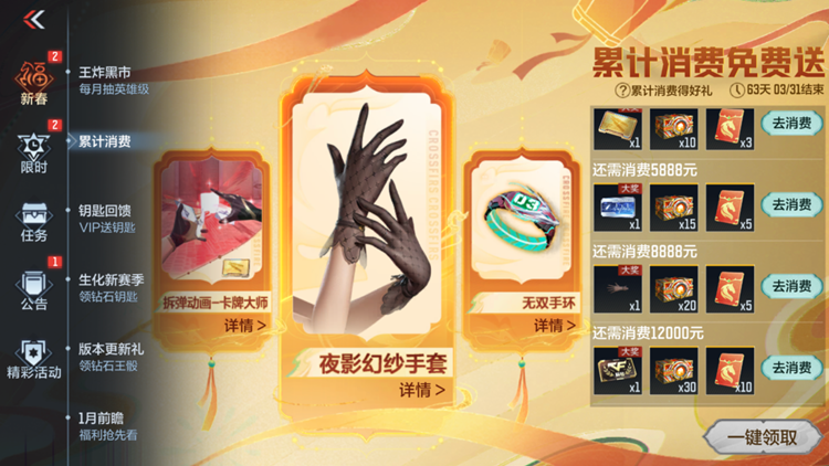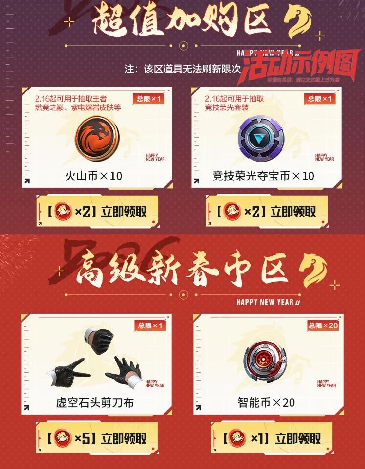 二月新春宝库福利重磅来袭!活动拥有三大兑换区:超值加购区可兑换熔岩夺宝十连抽、竞技荣光币及钻石等核心道具;高级新春币区可兑换趣味武器“虚空石头剪刀布”,并支持兑换智能币、炎龙币等多种稀有道具;新春币区则提供QBZ03-天罚、地狱烈炎等热门武器抽奖及各类宝箱。玩家通过登录、邀请回归好友即可轻松获取兑换币,回归玩家福利丰厚,更有大神挑战排行榜奖励武圣系列等强力套装哦!