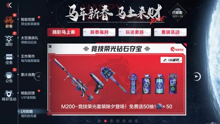 竞技荣光钻石夺宝将于2月16日上架游戏中,夺宝活动包含以M200-竞界荣光为主武器的竞界荣光套装与投掷套装,活动上架时将免费送50次抽奖次数,可以为想要获得这套竞界荣光系列武器的CFer大幅度降低获取难度。