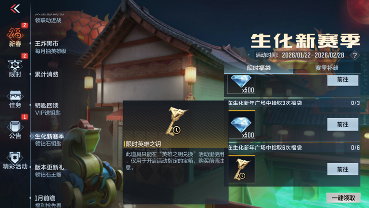 生化模式迎来重磅更新,全新地图生化新年广场-狂欢上线,为终极生化带来熟悉又新鲜的对战场景,参与活动即可领取大量钻石奖励与限时英雄之钥等其他豪华奖励。