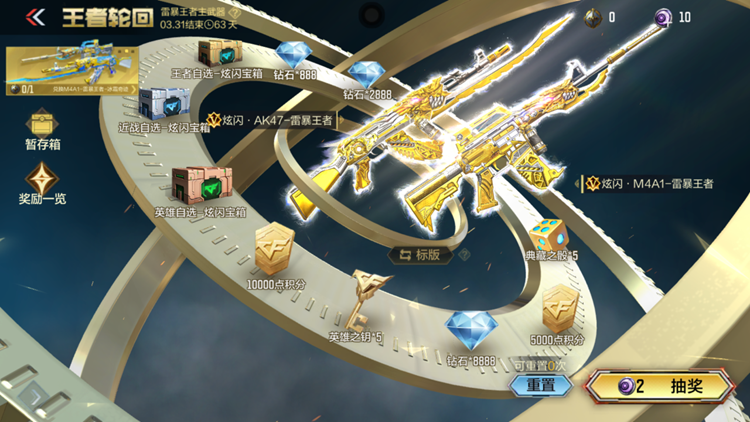 本期王者轮回集结了多款顶级武器,不仅首发亮相了炫闪版本的M4A1-雷暴王者和AK47-雷暴王者,更有王者之势、王者之翼等经典武器限时返场。奖池中还包括赏金令积分卡、典藏之骰等高价值道具,是CFer们冲击一线主战神器、丰富武器库的绝佳机会,活动时间非常充裕,各位兄弟千万不要错过啦!