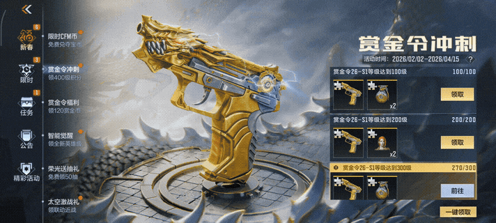 各位CFer大家好,2026年S1赏金令已重磅开启,本次赛季不仅返场了COP 357- 雷霆王者、高爆手雷-雷霆王者等热门王者武器,更有多款王者系列冰霜奇迹皮肤同步上线。部分玩家虽对这些道具满怀期待,却面临赏金币储备不足的困扰,那么今天火线姐将为大家带来赏金令专属福利活动,高效助力大家获取赏金币以及26-S1赏金令大奖的碎片,轻松兑换心仪道具!