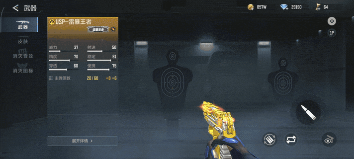 USP-雷暴王者整体采用黄金质感材质打造,枪身雕刻着狰狞的兽纹浮雕,造型华丽且极具威慑力。在生化模式中,它拥有伤害与载弹量双重提升的专属增益,配合精准稳定的弹道,既能持续压制幽灵,又能为全背包手枪提供子弹加成。之前没有入手王者之迹的小伙伴们,可以考虑入手这把王者副武器,需要60个【零件】USP-雷暴王者就可以合成。