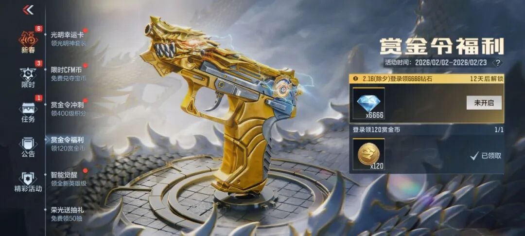 此外,新春福利加码来袭,2月16日除夕当天登录游戏,即可直接领取6666 钻石的重磅奖励,获取方式零门槛,无需完成额外任务,登录即得,建议各位 CFer准时上线锁定福利。同时,针对关注M200-竞技荣光套装的玩家,本次领取的钻石可进行专项储备,待后续M200-竞技荣光系列活动上线时,即可直接用于道具兑换或保底抽取,为获取心仪套装做准备。