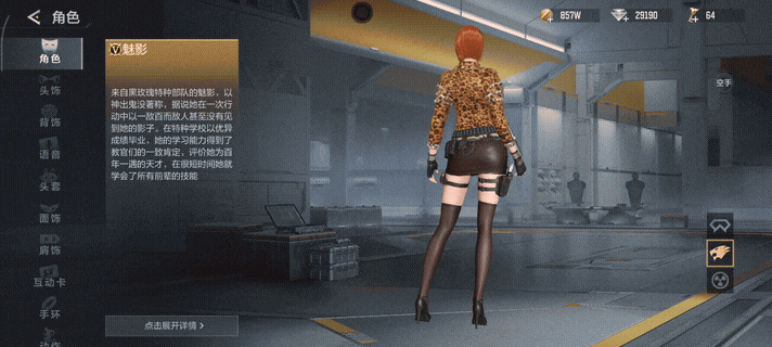 魅影以红棕发色搭配豹纹外套、皮质短裙与过膝长靴的造型登场。她的技能优势全面:自带减少闪光效果、免疫己方手雷伤害、高处掉落无伤等属性,还配备挑战模式专属爆炸剑,在挑战模式拥有专属武器和专属技能,是竞技与挑战双场景适配的全能角色,合成需要100个【招募证】魅影。