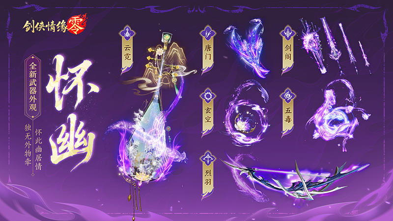 全新武器外观·怀幽登场。活动期间,少侠可通过霓裳云匣获得限定武器自选外观箱·怀幽,开启后即可自选限定外观「怀幽」、「凝金」或「朱明」!同时,云匣商店可兑换奖励岁华葫芦、潜龙锥、灵息玉、灵宠经验丹(中)、修为丹等豪礼。