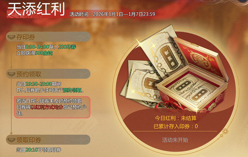 少侠每日8:00-14:00期间,在【馈礼】-【华章馈礼】-【天添红利】处存入印券,立得海量金锭!存入当天晚上19:30-20:00期间,还可预约取回印券,预约成功后,20:10分将返还当天存入印券并可参与瓜分本日本服未预约领取的少侠所存印券!